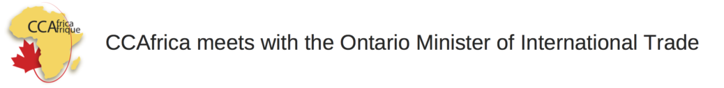 On November 29, 2016, Nola Kianza, President & CEO, Canadian Council on Africa met with Hon. Michael Chan, Ontario Minister of International Trade to discuss trade and investment opportunities in Africa and ways to promote Ontario’s companies, technologies and capabilities to the African market.