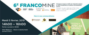 Principaux risques et défis de l’industrie minière en 2019 notamment en matière d’acceptabilité sociale. / Principal risks and challenges of the mining industry in 2019 notably with regard to social acceptability. Description: PDAC a le plaisir de vous inviter à la 6ème édition de Franco-Mine à Mining Indaba 2019. En collaboration avec le gouvernement du Canada, le Conseil canadien pour l'Afrique et McCarthy Tétreault, Franco-Mine offre une plateforme d'échanges en français entre les délégués africains et canadiens et autres participants à Mining…