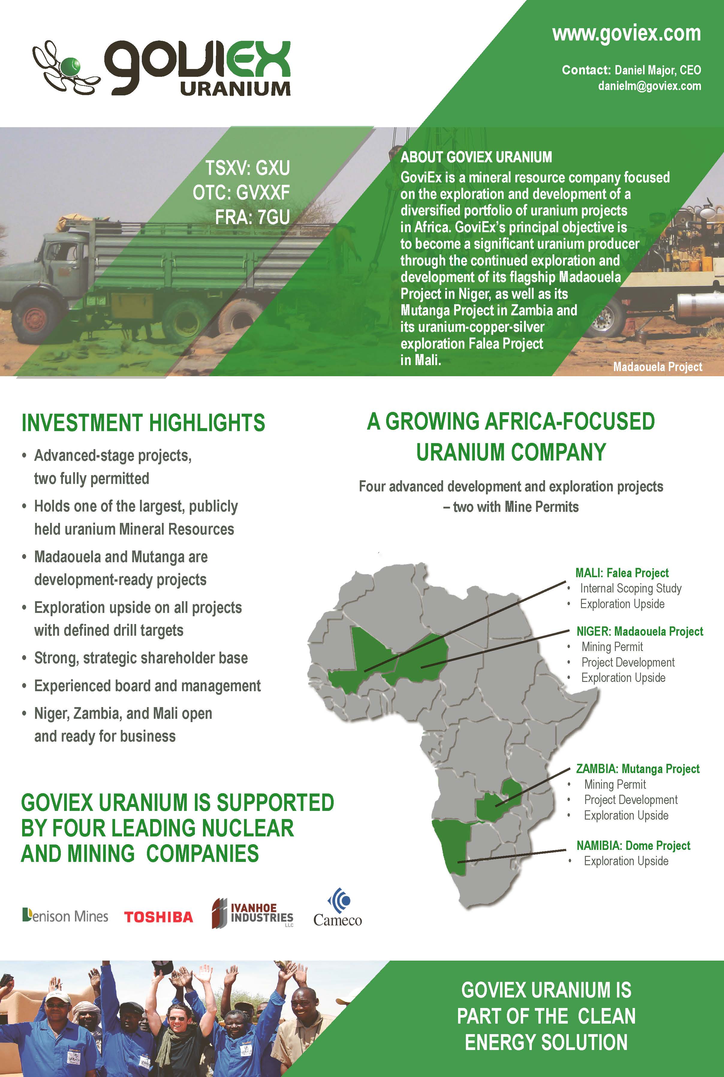 GoviEx Uranium Inc. (TSX-V: GXU; OTCQB: GVXXF) is a mineral resource company focused on the exploration and development of its African uranium properties. GoviEx’s principal objective is to become a significant uranium producer through the continued exploration and development of its mine-permitted Madaouela Project in Niger, its mine-permitted Mutanga Project in Zambia, and its exploration Falea Project in Mali. GoviEx benefits from a highly experienced board and management team, in addition to the support of major industry shareholders, including word-class leaders in minerals exploration and uranium.